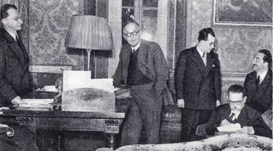 Riunione del primo governo presieduto da Alcide De Gasperi (DC), con Pietro Nenni (PSIUP), Palmiro Togliatti (PCI), Leone Cattani (PLI) ed Emilio Lussu (PdA).