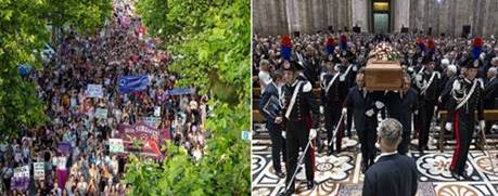 Coincidenze temporali del 14/6/2023 – Scioperi femministi a nord delle Alpi (foto a sin.), funerali di Stato per Berlusconi al Duomo di Milano (a destra)