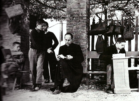 Don Lorenzo Milani insieme ai suoi studenti di Barbiana, fotografia di Oliviero Toscani, 1959